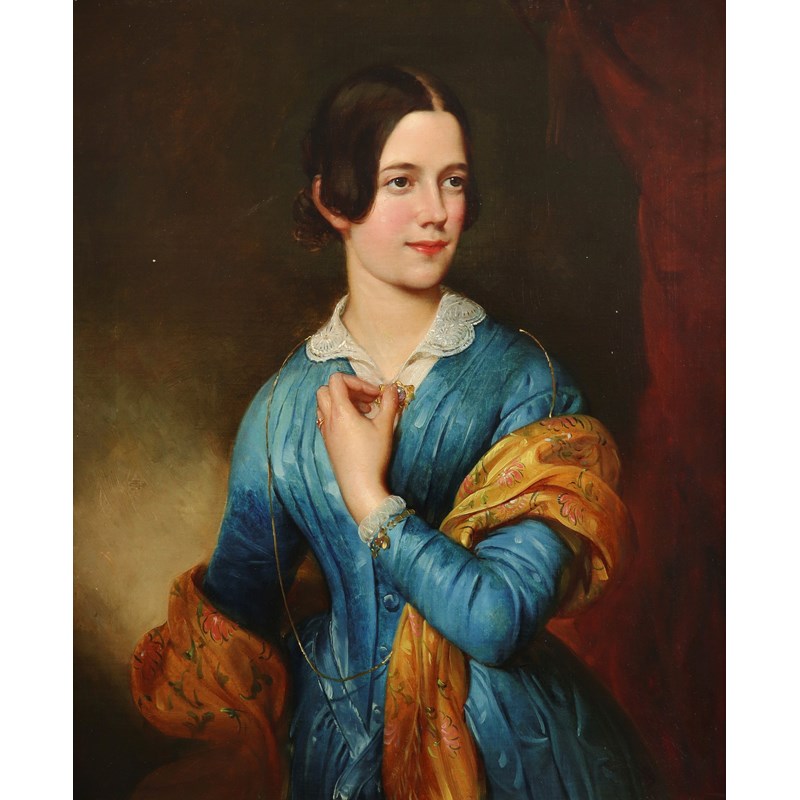 Portrait of a lady, half-length, wearing a blue dress and yellow shawl