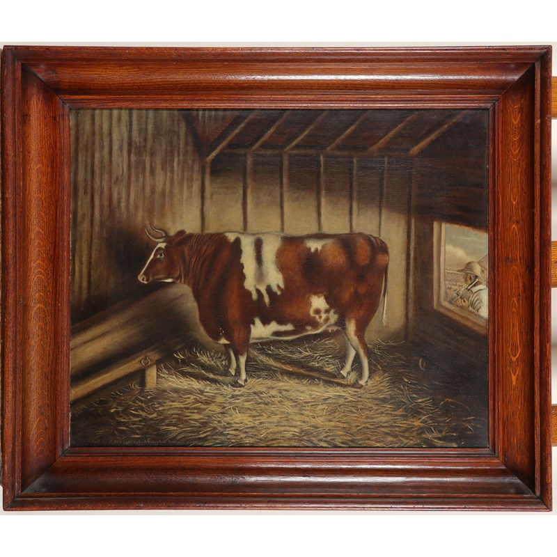 A label on the stretcher reads 'This seven year old cow fed by J. Mundy was put to feeding on the 24th January 1833 and killed on the 13th Dec 1833 weighed 155 stone 5 lbd - Milked to 22nd January 1833.'