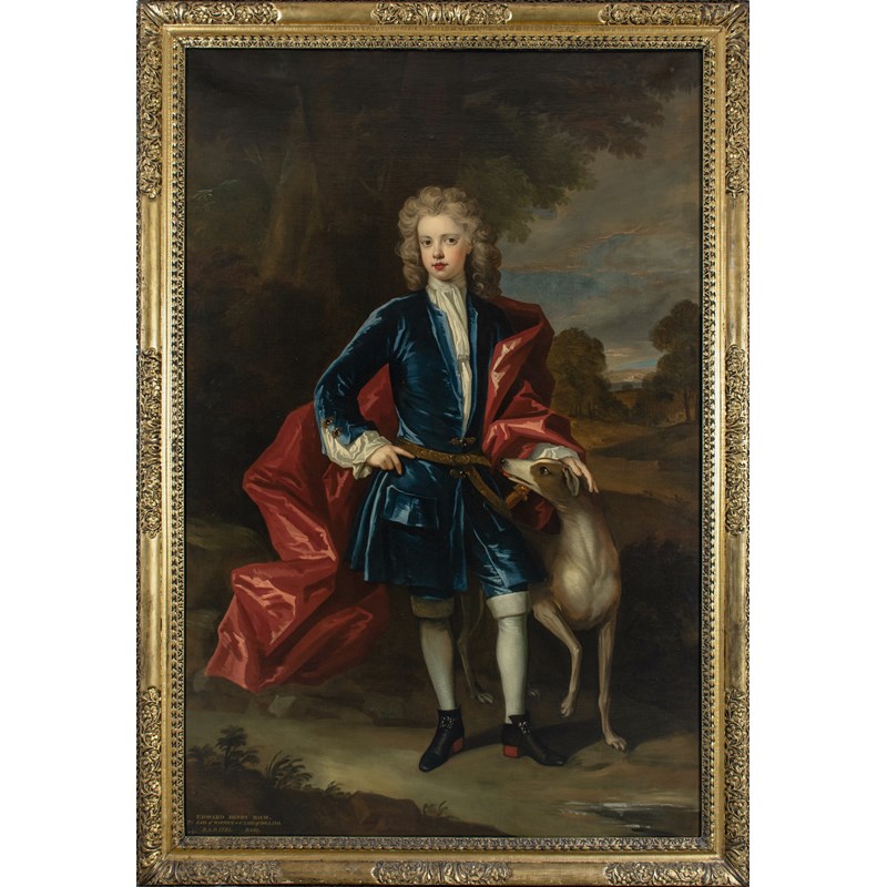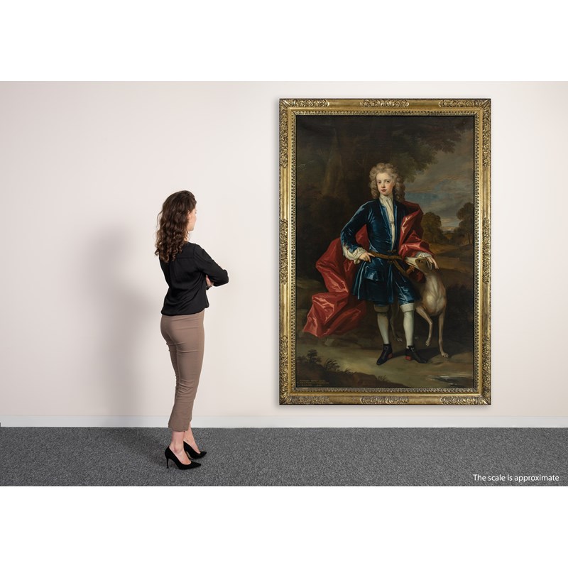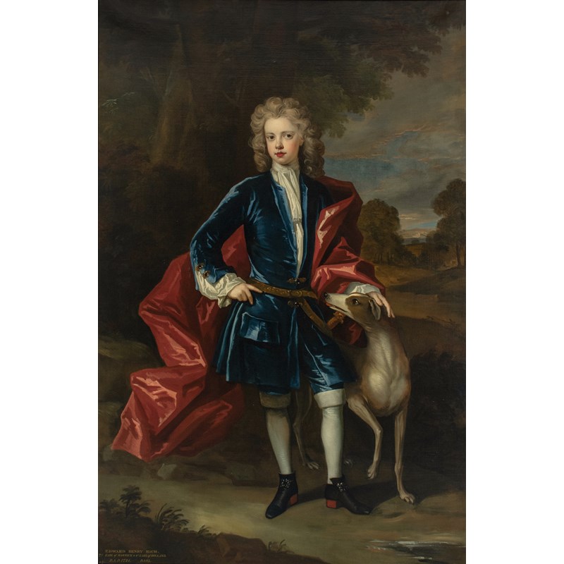 Portrait of Edward Henry Rich, 9th Baron Rich, 7th Earl of Warwick and 4th Earl of Holland (1698-1721), full-length, wearing a blue coat and red cloak, standing with a greyhound in a landscape