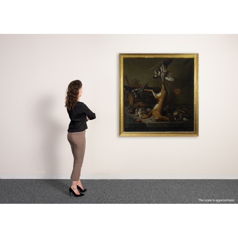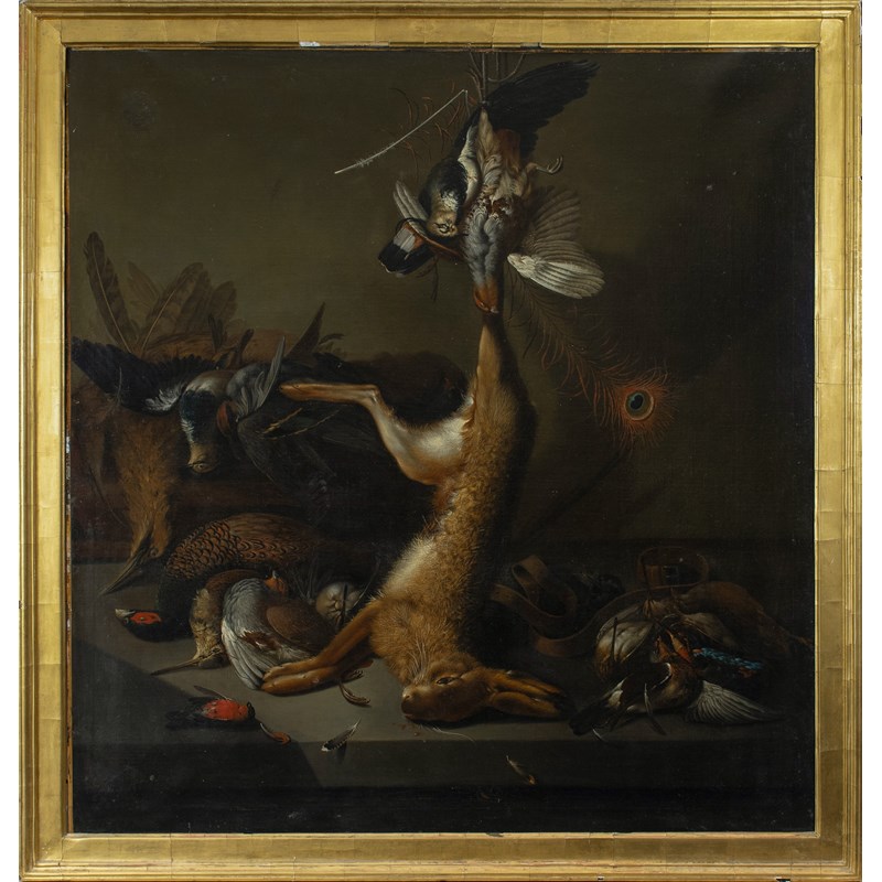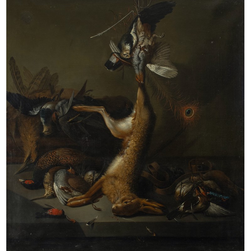 Still Life of a dead hare, woodcock, pheasant, partridge and kingfisher