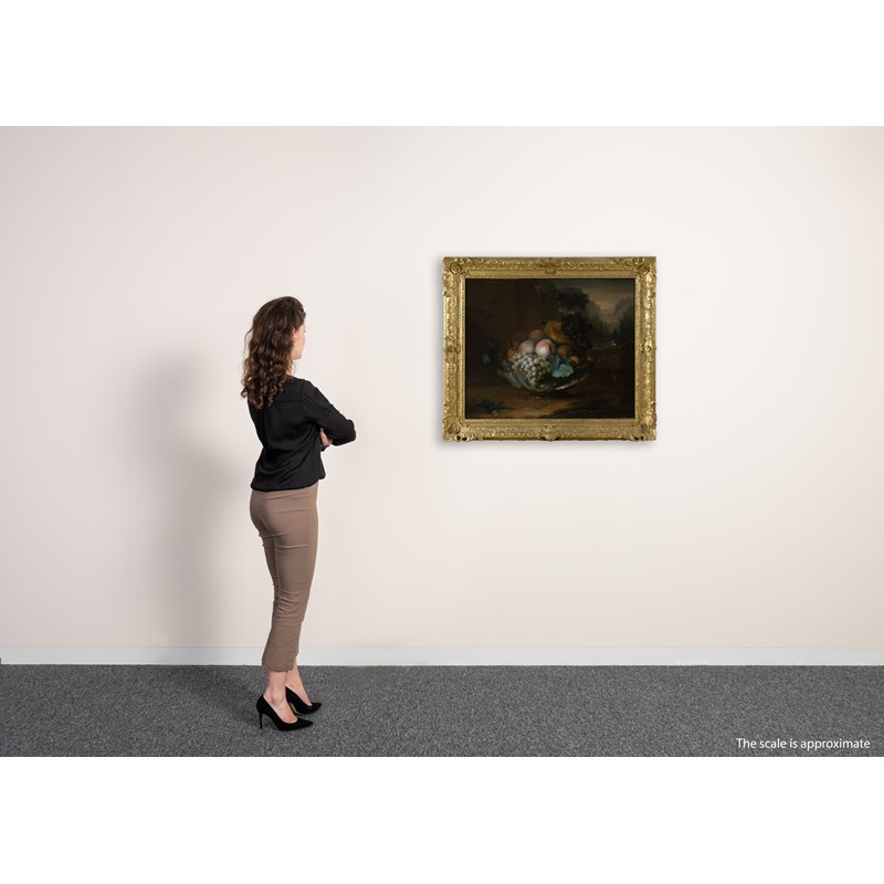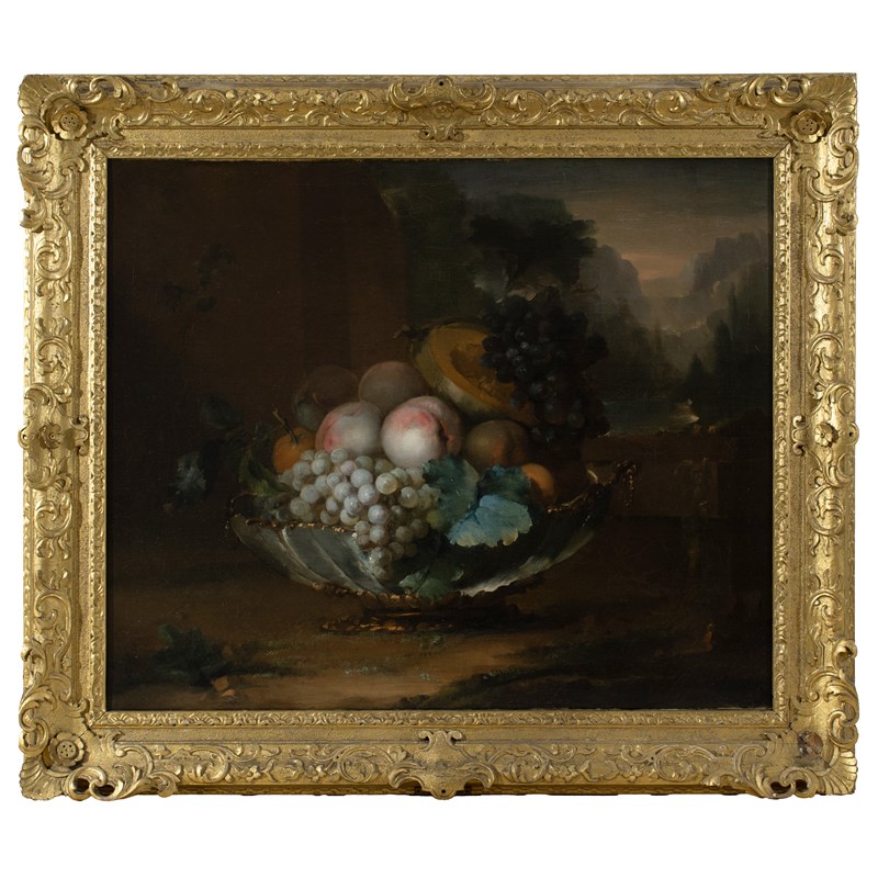 Still life with fruit in an ormolu mounted glass dish, a park landscape beyond