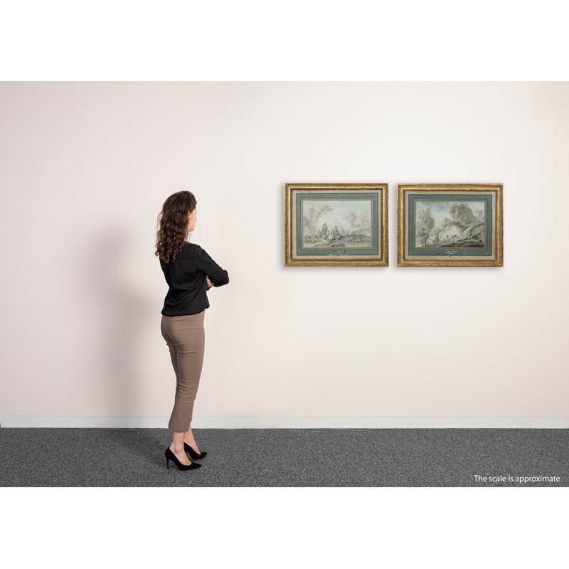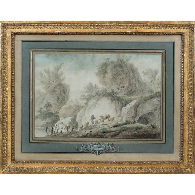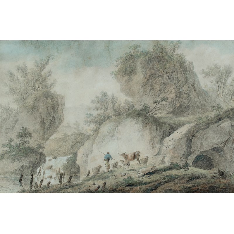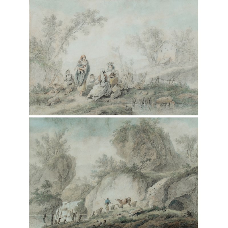 Landscape with rustics resting by a pond, a cottage beyond; Landscape with a herdsman in a rocky river landscape