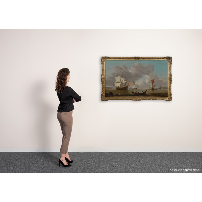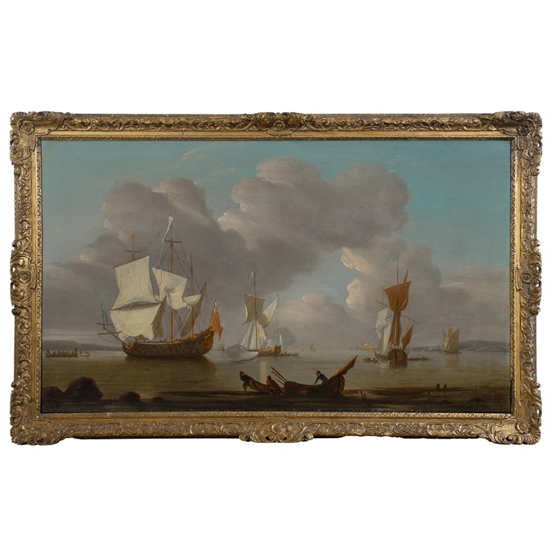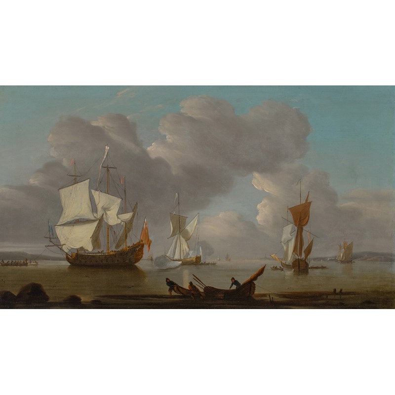 A flagship drying her sails inshore, with two Admiralty yachts and other smaller craft nearby