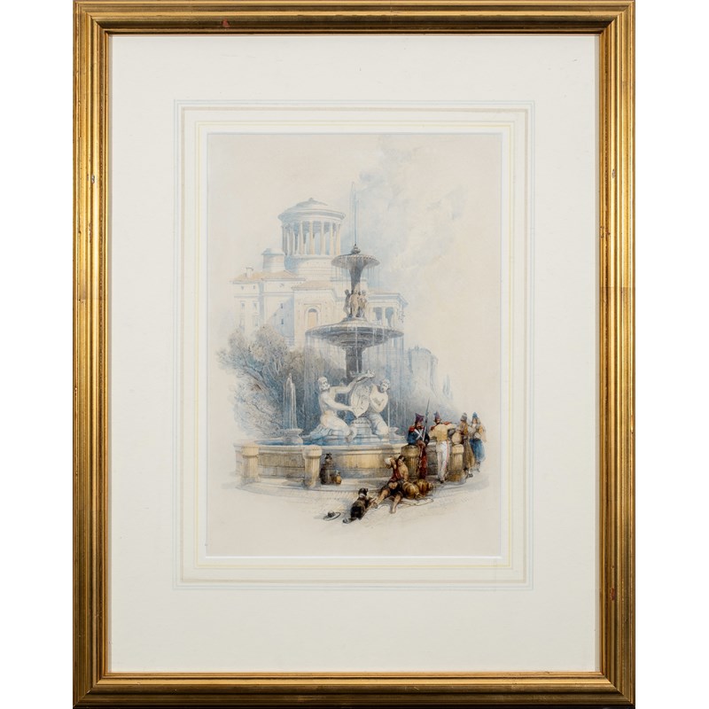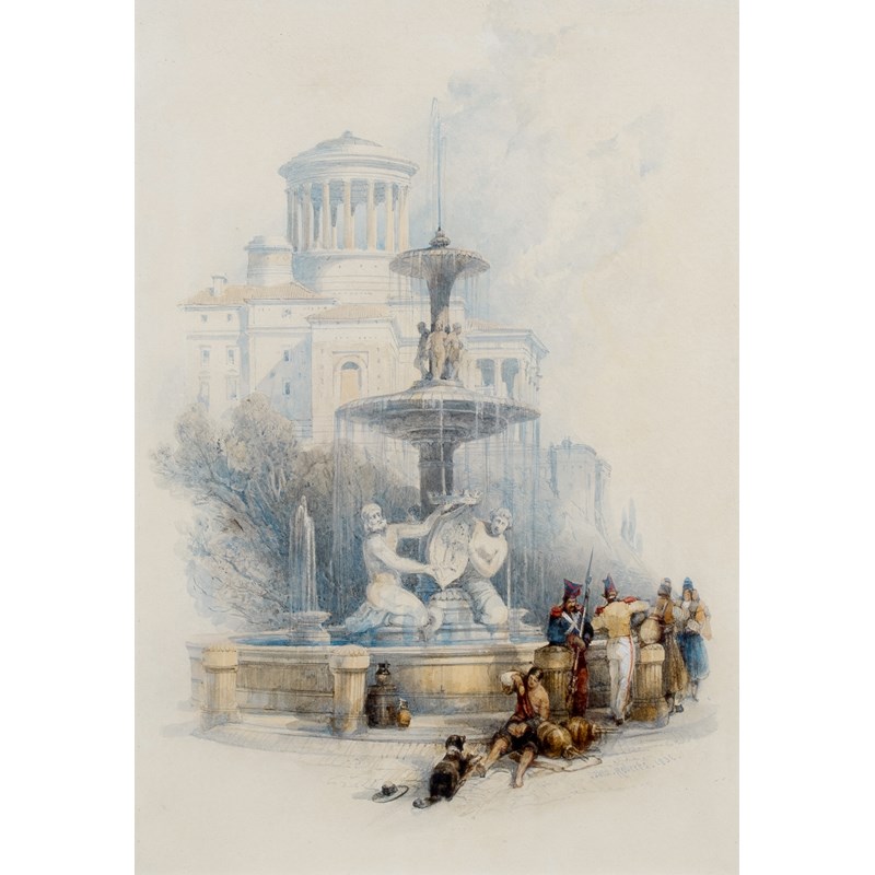 The present work depicts the Fountain of the Artichoke, Madrid. David Roberts made an on-the-spot sketch dated 1833 from a different viewpoint, with the observatory on the right, and there is a further version with different figures (both in private collections).