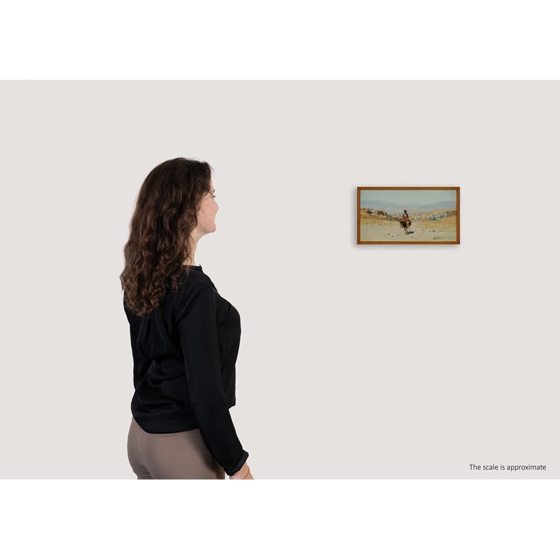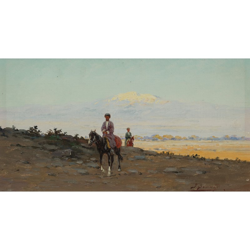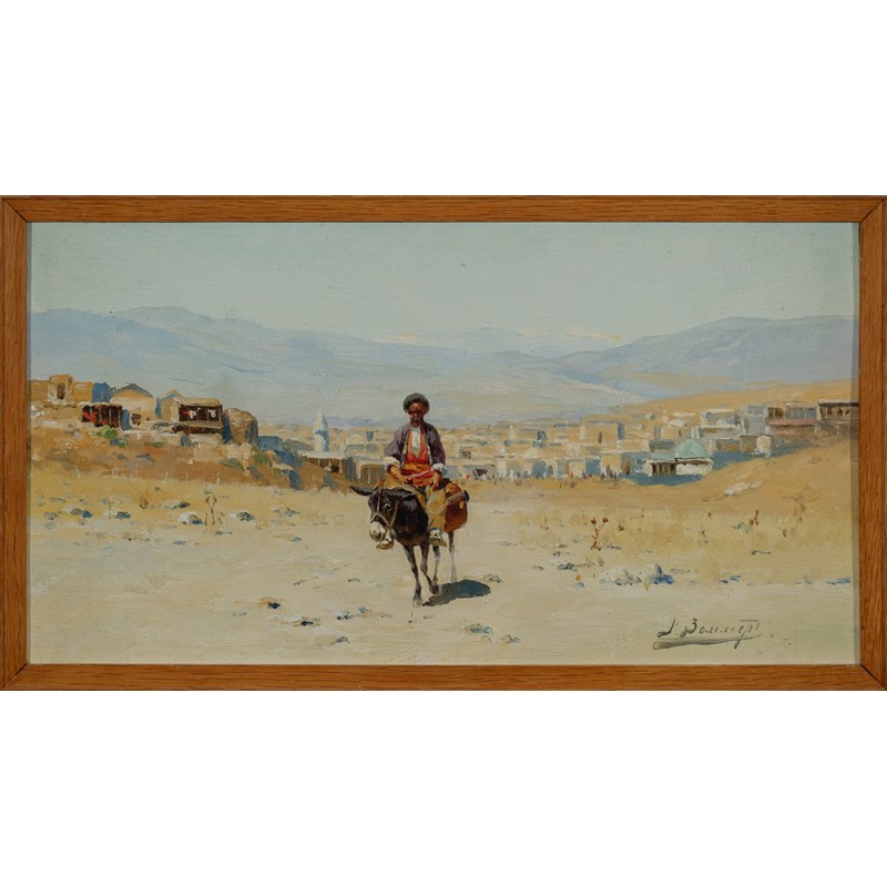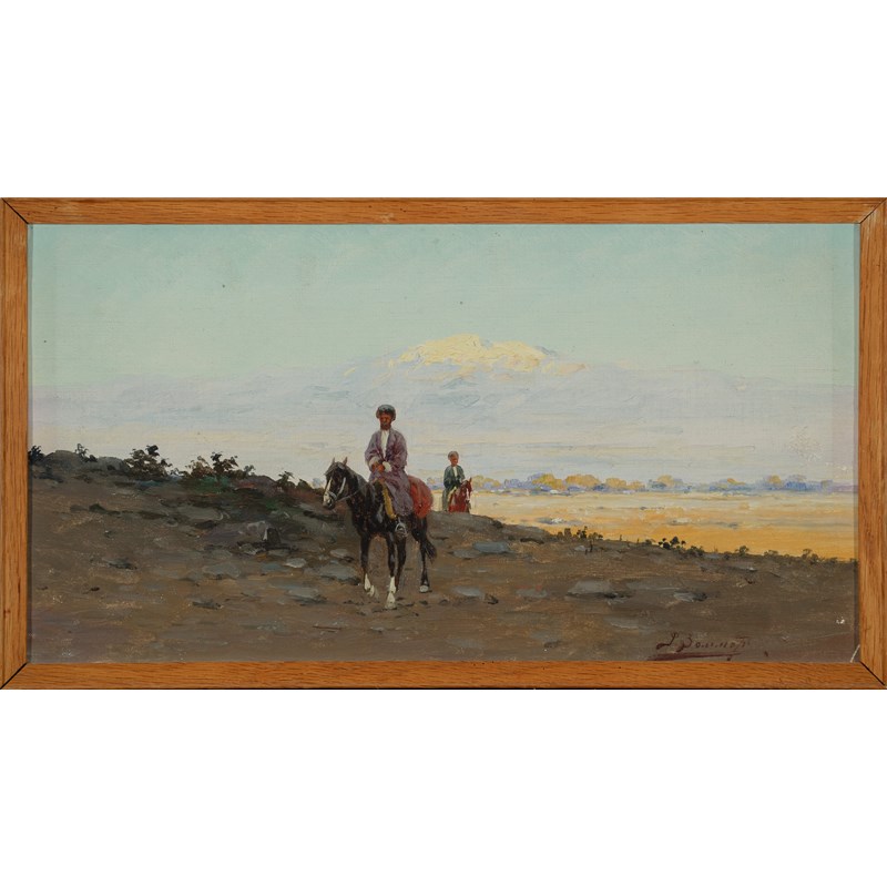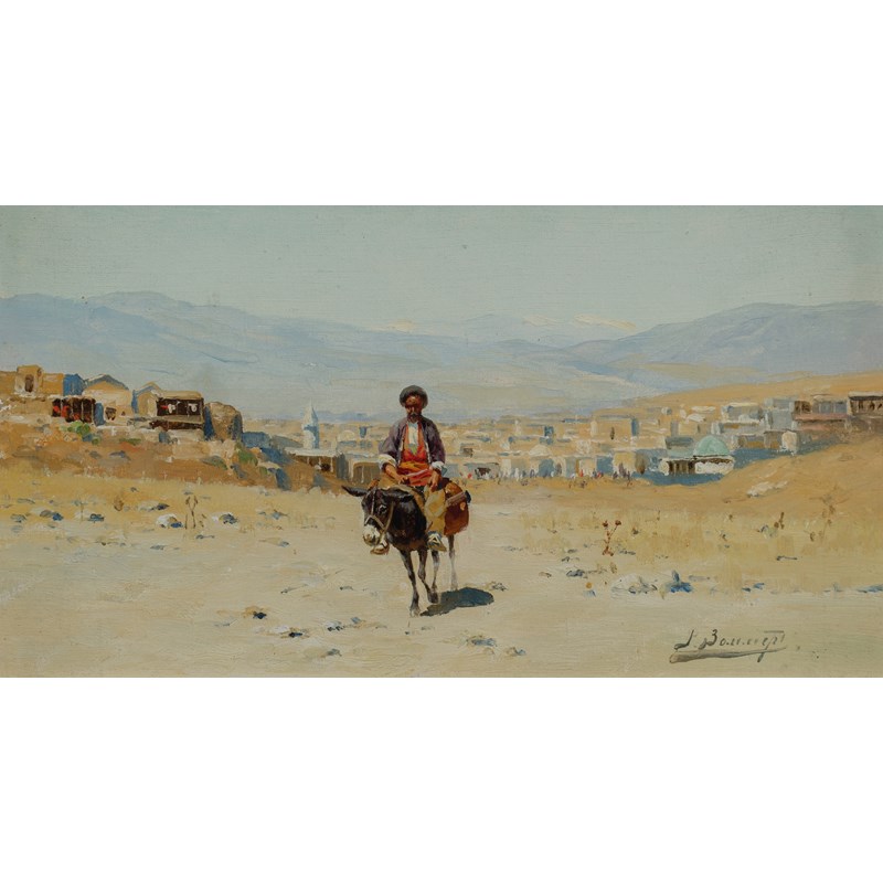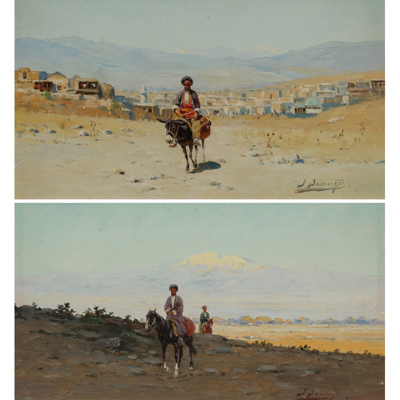 A figure on a donkey on the outskirts of an Oriental town; Mountainous landscape with two figures on horseback