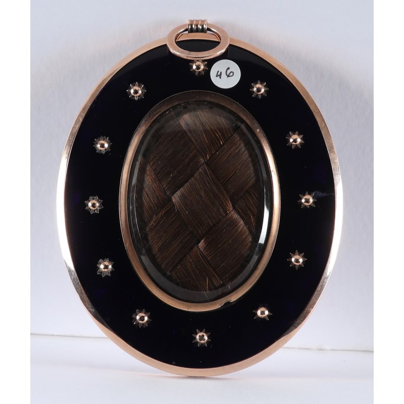 Oval, in a gilt metal frame with plaited hair and blue glass over guilloché back, within a tooled maroon leather case
