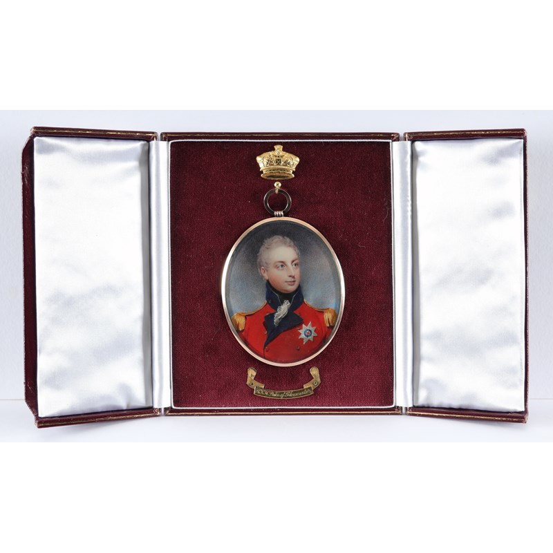 The miniature is a copy of a full length portrait by Sir William Beechey RA (1753-1839). William Wood painted miniature copies of this work, and a portrait of Prince William Henry, 1st Duke of Gloucester (1743-1805), at Beechey's request. Wood's version of the the 1st Duke is in the Royal Collection (RCIN 420254)