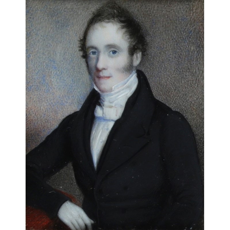 λEnglish School 19th Century Portrait miniature of a gentleman in a black coat; Portrait...