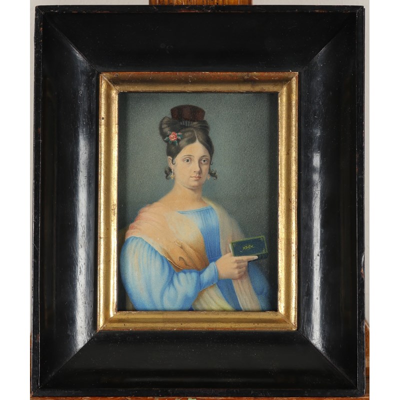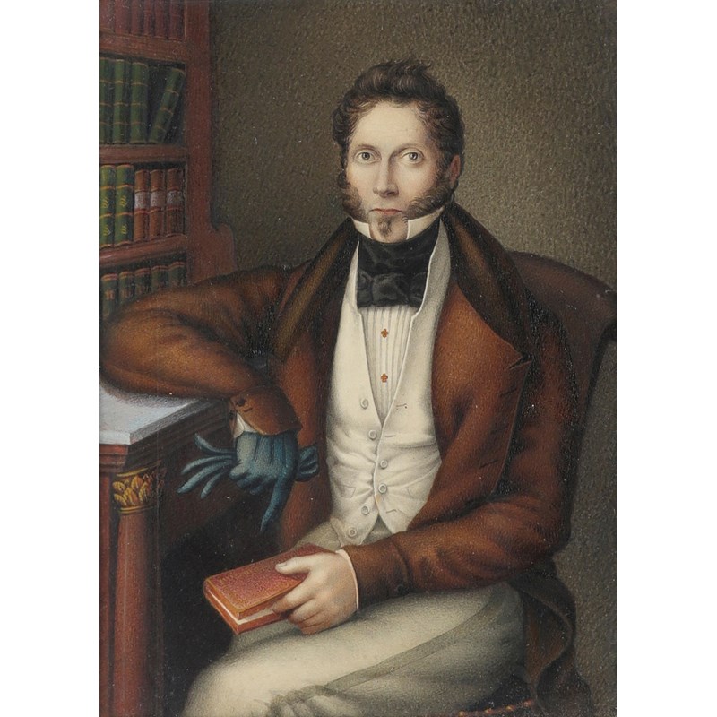Portrait miniature on a gentleman in a brown coat sitting in his library; Portrait miniature of a lady in a blue dress holding a book