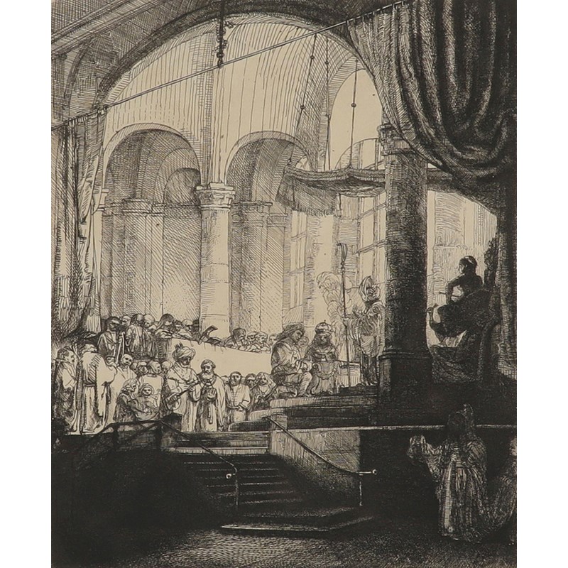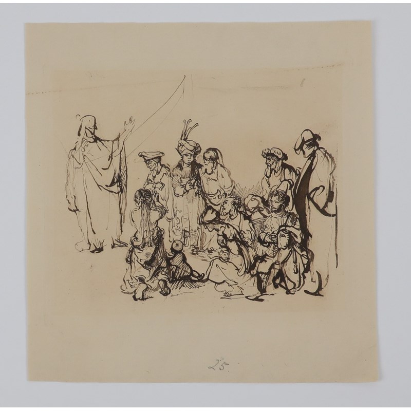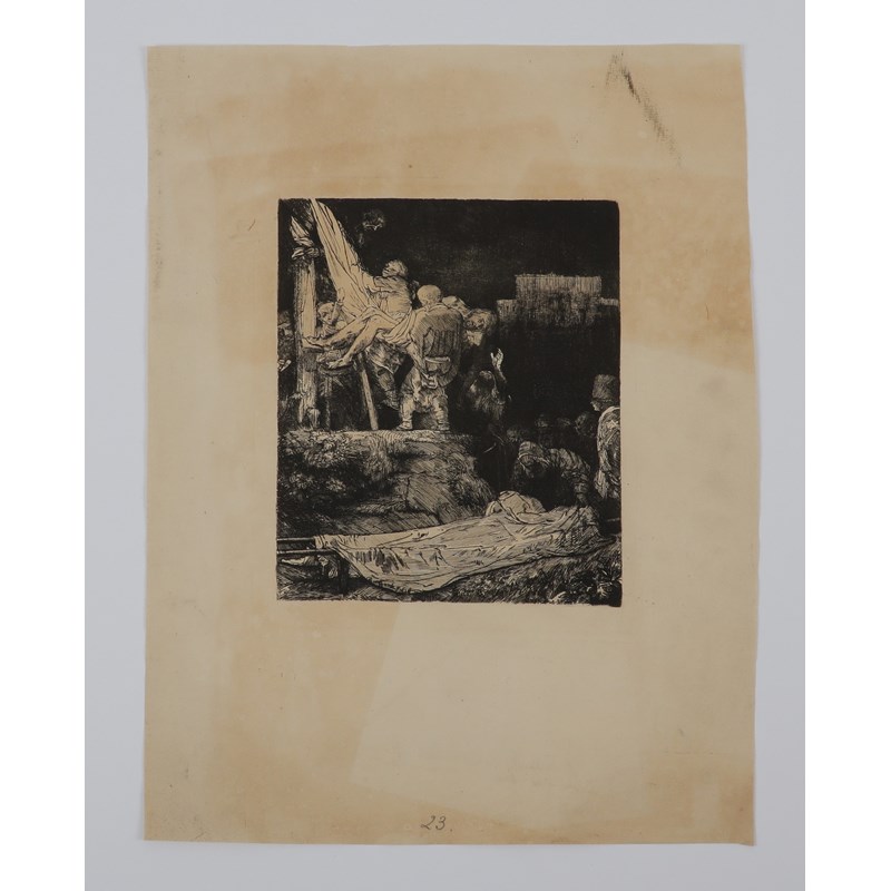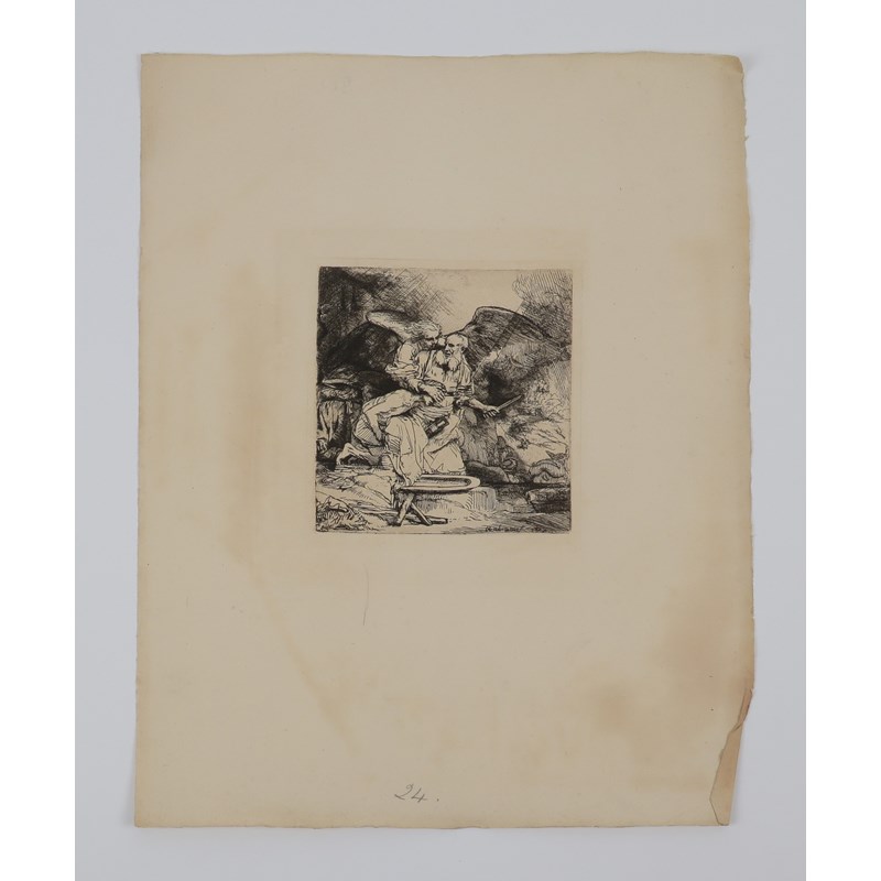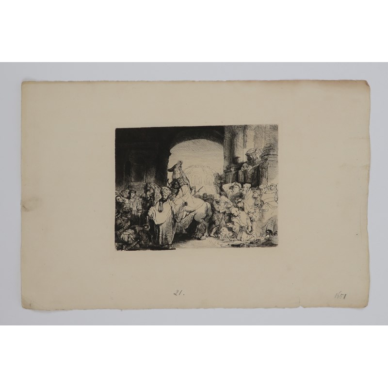 Beggar man and beggar woman conversing; The artist's mother seated at a table, looking right: three-quarter length; The blind fiddler; A peasant calling out 'Tis vinnich kout' and A peasant replying 'Dats niet'; The crucifixion; View of Amsterdam from the north-west; The Omval; Cottages beside a canal; Self-portrait drawing at a window; Medea: or the marriage of Jason and Creusa; The triumph of Mordechai; The descent from the cross by torchlight; Abraham's sacrifice; Christ preaching