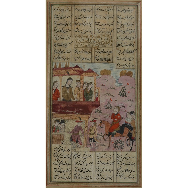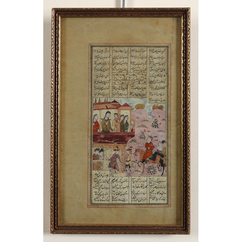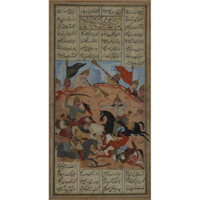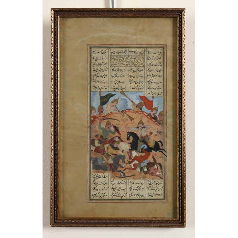 With two further Persian watercolours scenes depicting a battle and a hunting party returning home, with text, each 22 x 10cm; 8¾ x 4in (3)