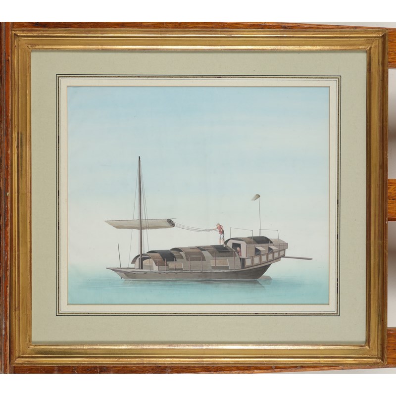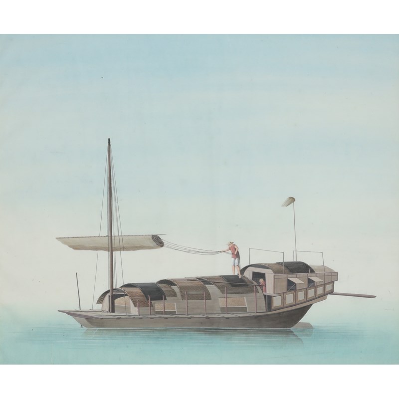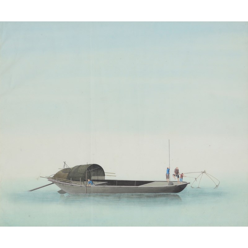 Chinese School Chinese junk with fishermen casting a net; Chinese junk with a fisherman tending...