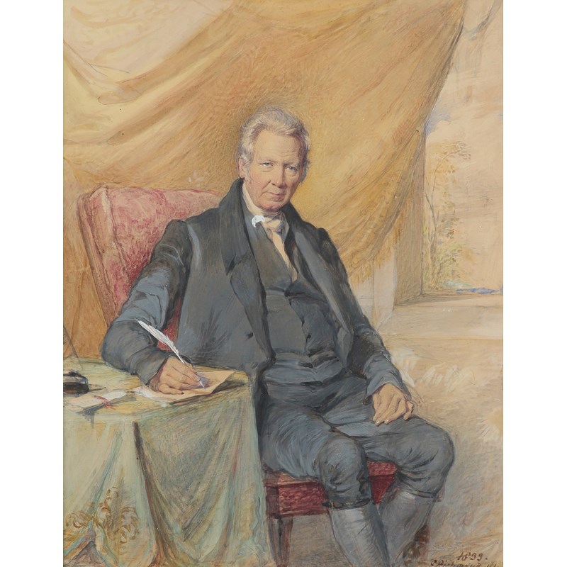 Portrait of a gentleman in a black coat and knee britches, seated and holding a pen