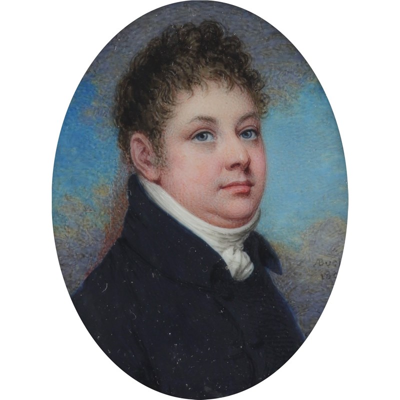 λAdam Buck (Irish 1759-1833) Portrait miniature of a gentleman in a blue coat and white stock...