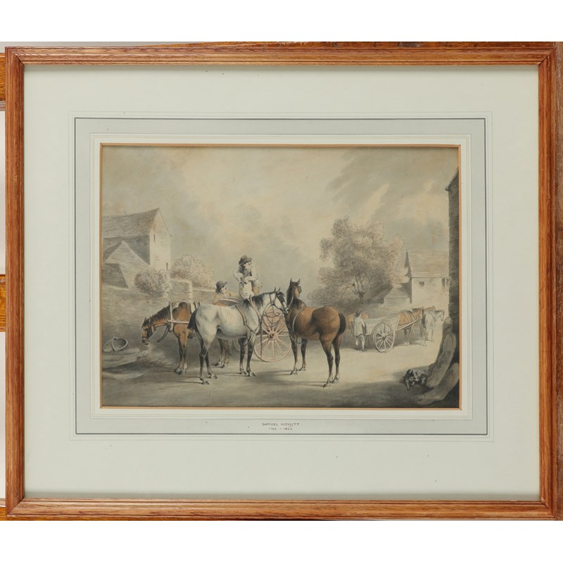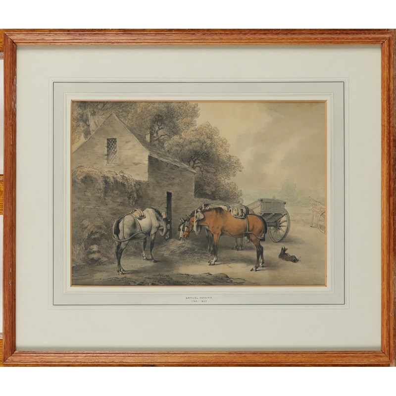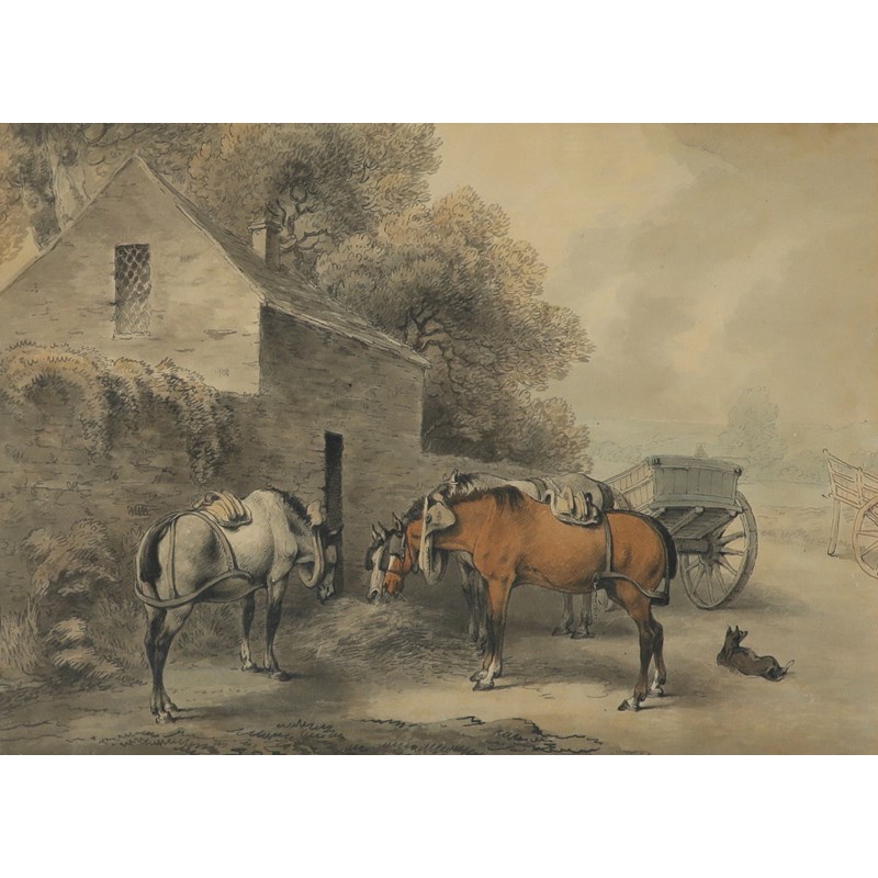 William Samuel Howitt (1765-1822) Three horses grazing near a building; Horse drawn cart being...