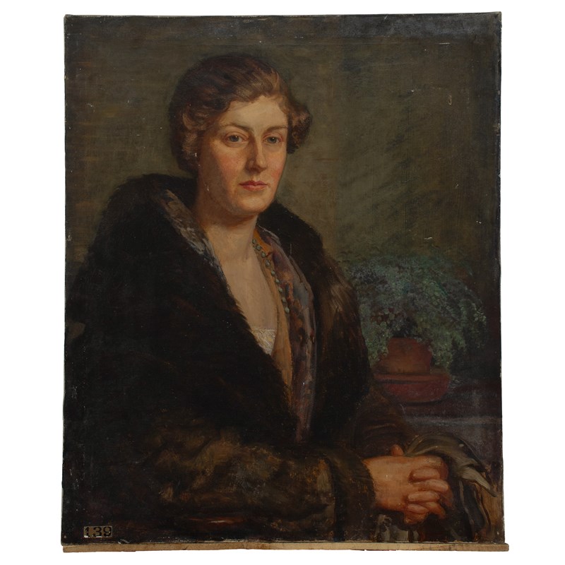 Portrait of a lady, half-length, wearing a fur-lined coat, seated in an interior
