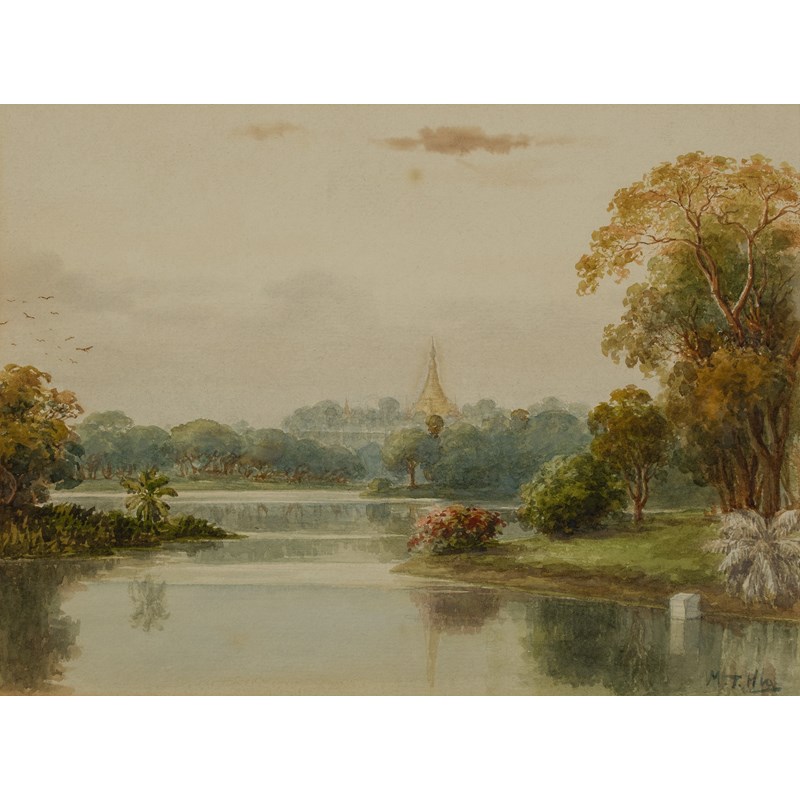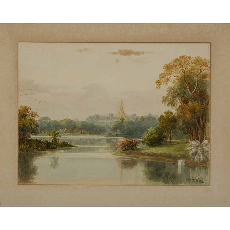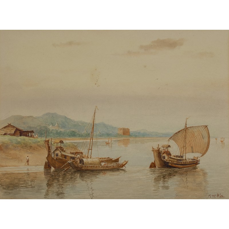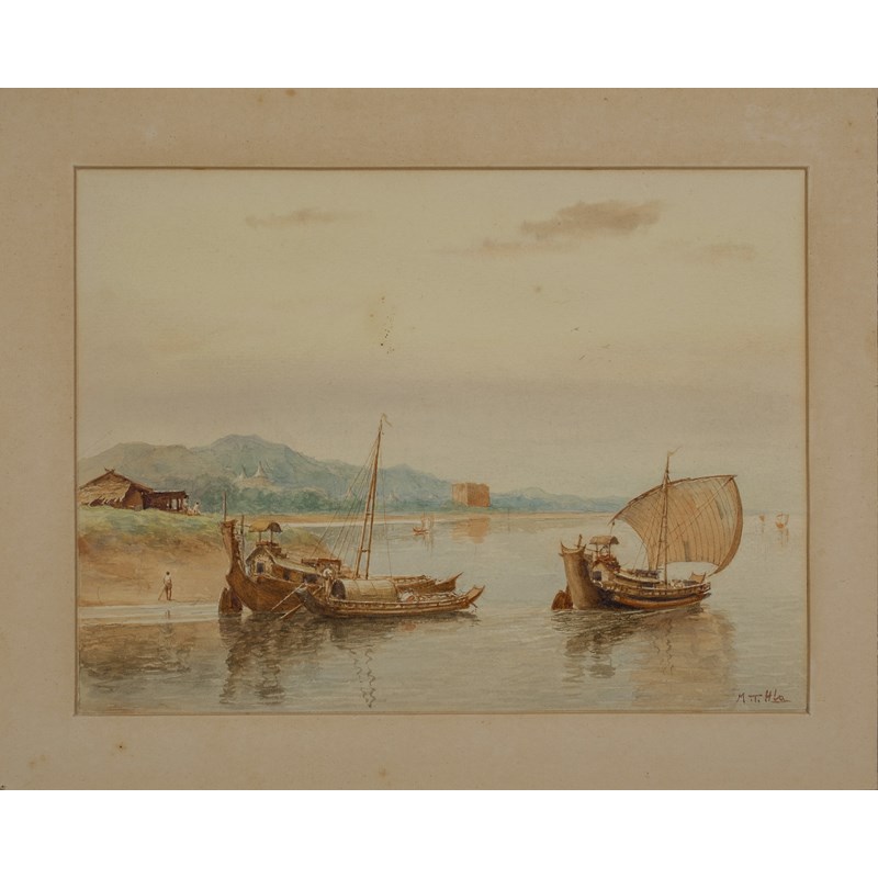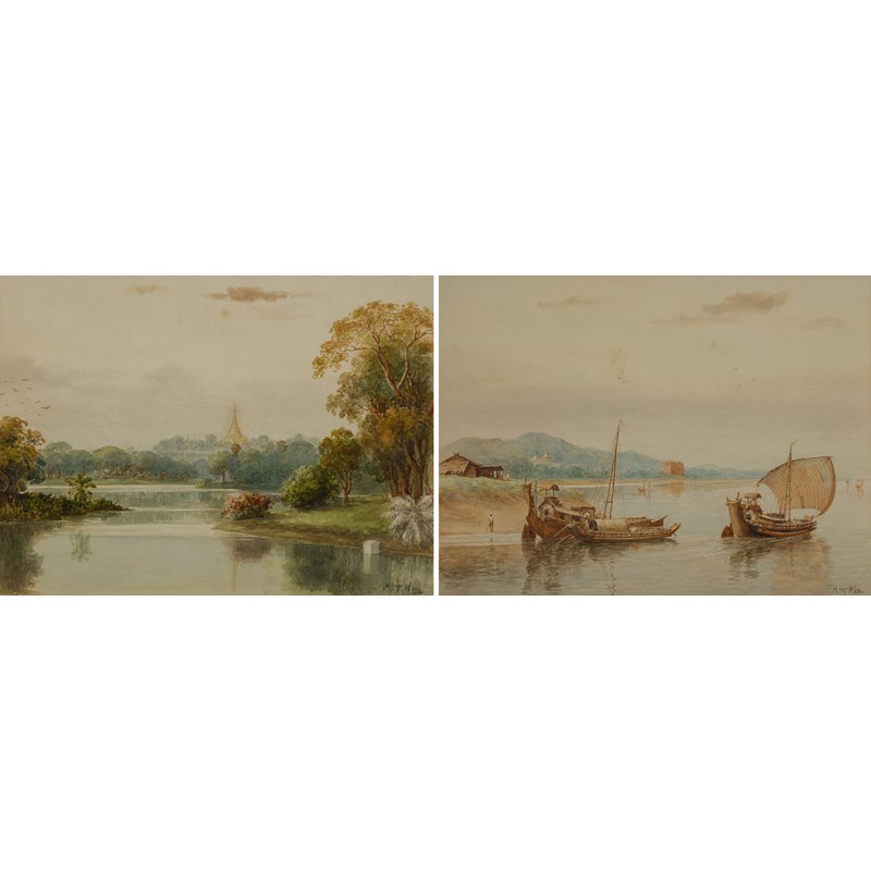 Lake landscape with the Mandalay Palace in the distance; River landscape with fishing boats