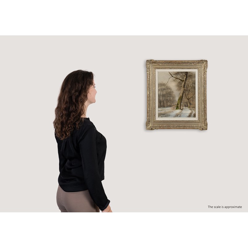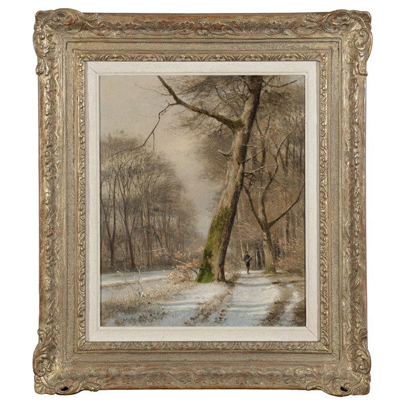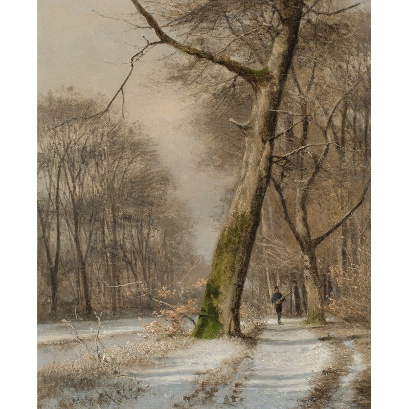 Winter landscape with a hunter on a tree-lined path