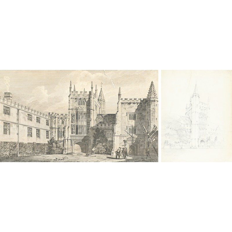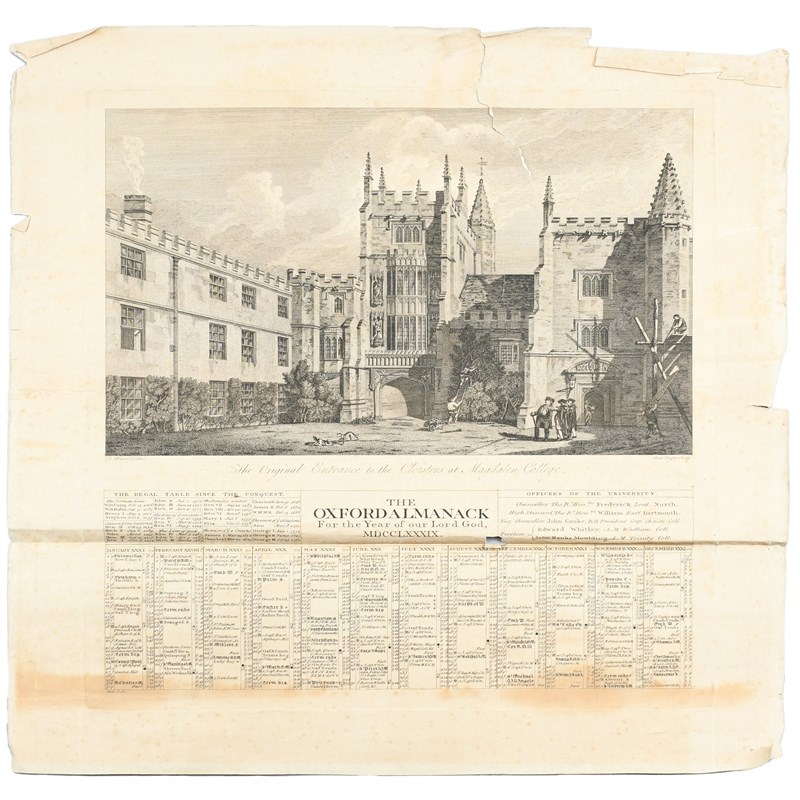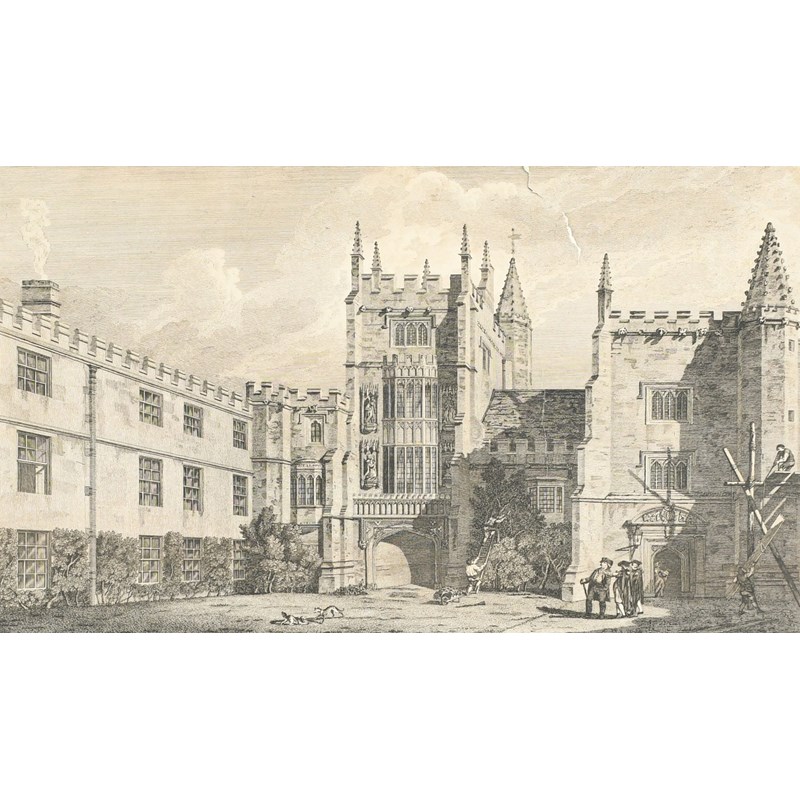 Together with Isaac Taylor (1730-1807) after Daniel Harris (act.1791-1799); The Original Entrance to the Cloisters at Magdalen College; Engraving, from The Oxford Almanack, 1789; 61.7 x 59.1cm; 24¼ x 23¼in; Unframed (3)