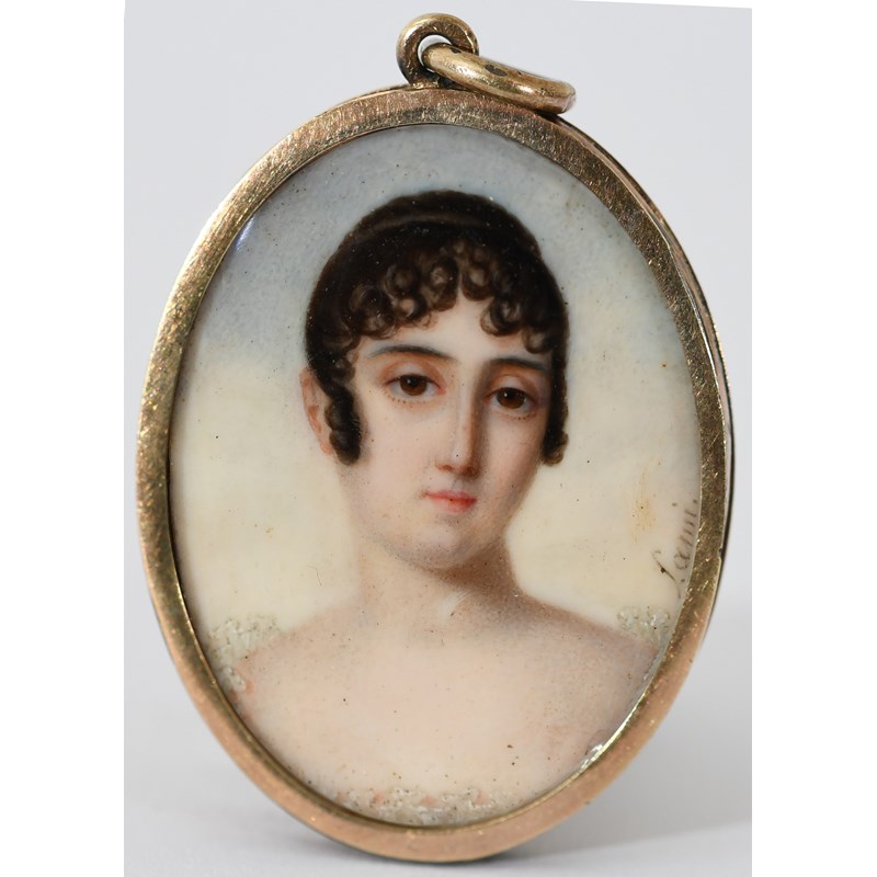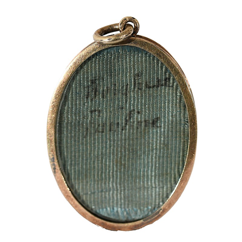 Oval, in a gilt metal frame, the glazed reverse over a silk back