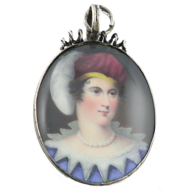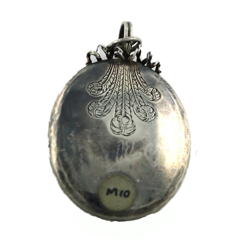 On enamel, oval, in a white metal frame with five ostrich feathers engraved to reverse