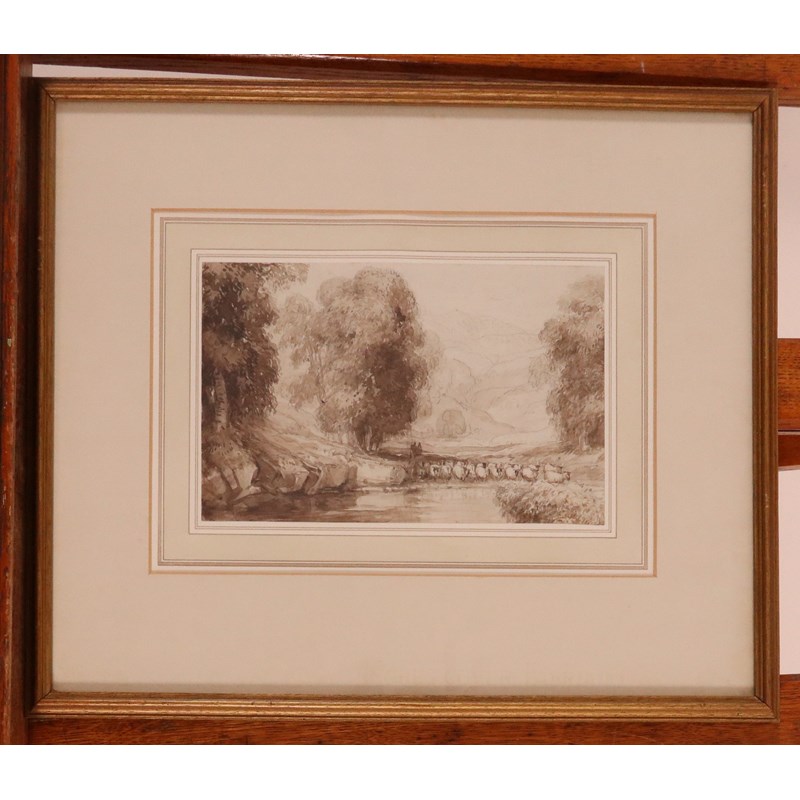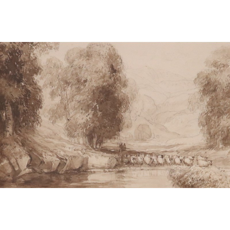 David Cox Snr. O.W.S. (1783-1859) A shepherd and flock in a river landscape Pencil and sepia...