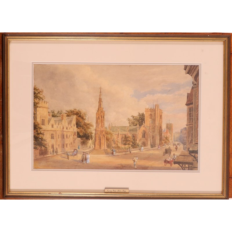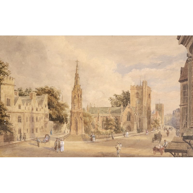 A view of Martyr's Cross, St Giles Oxford, looking South to Magdalen Street with Balliol College left, Randolph Hotel right and St Mary Magdalen Church behind the Memorial