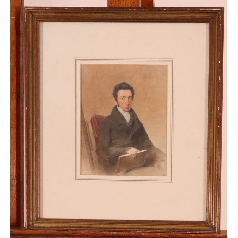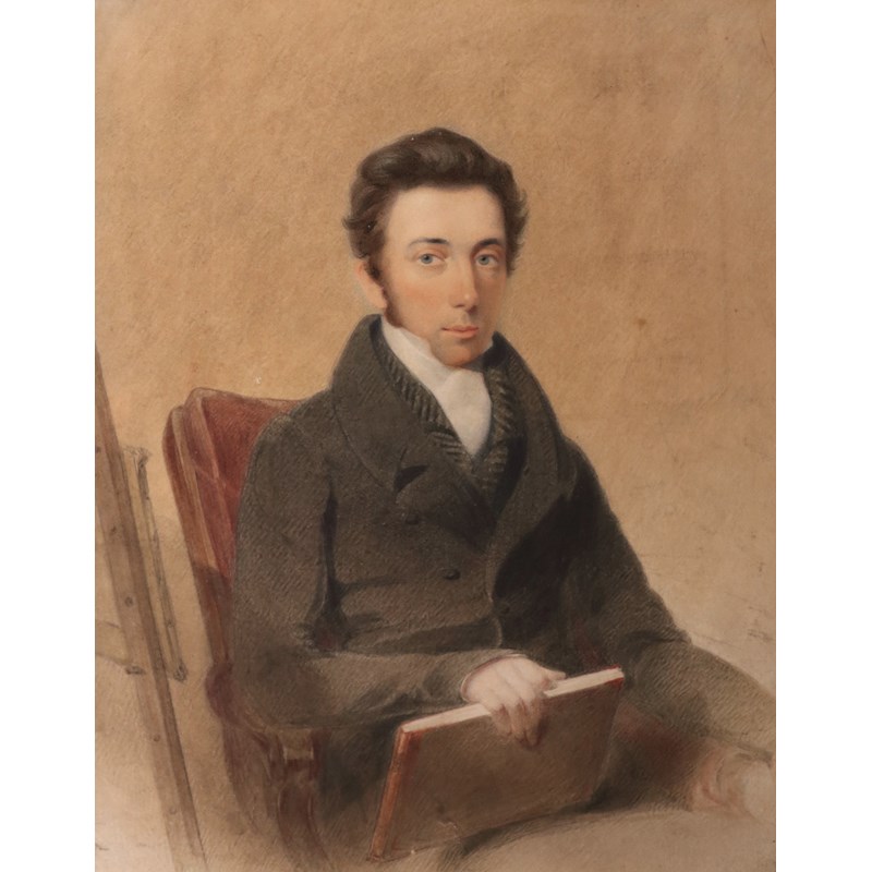 Portrait of an artist, seated with sketch book and easel