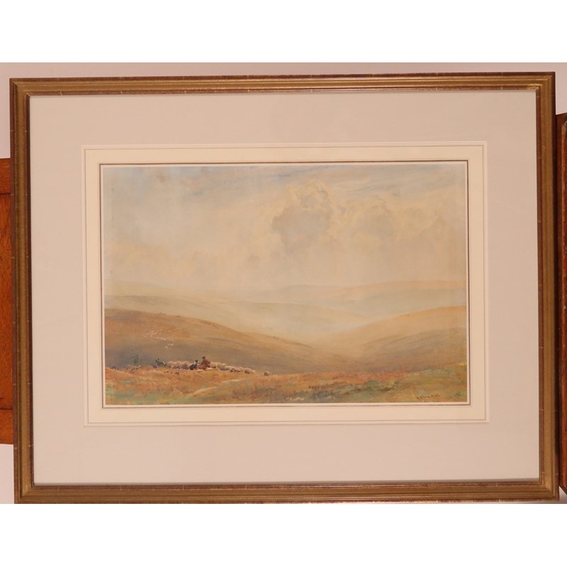 Robert Thorne Waite R.W.S. (1842-1935) A shepherd and flock with his sheepdog on the South Downs...