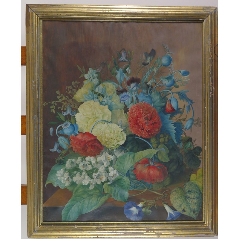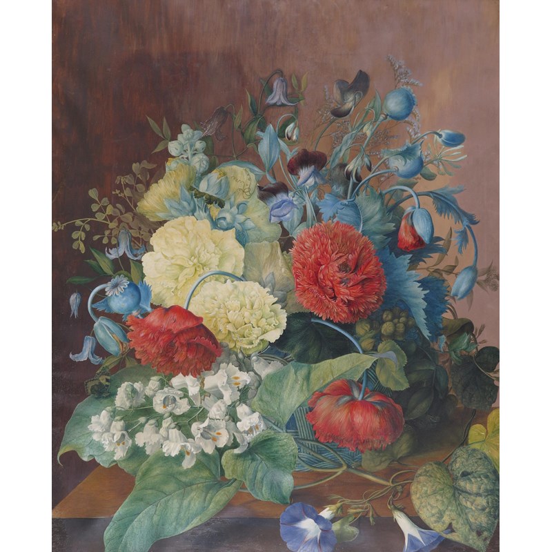 Still life of tulips, poppies and sweet peas in a basket on a table