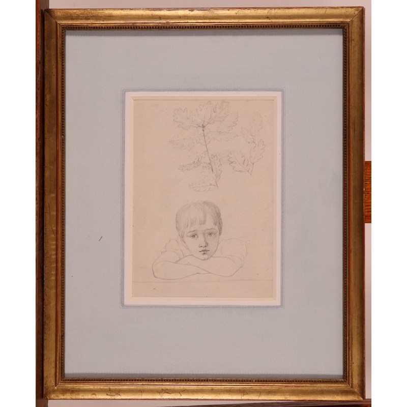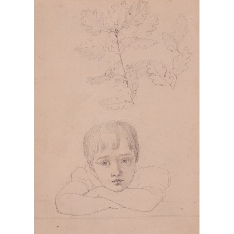 Peter Rittig (German 1789-1840) Portrait of a pensive boy with a study of a branch of an oak tree...