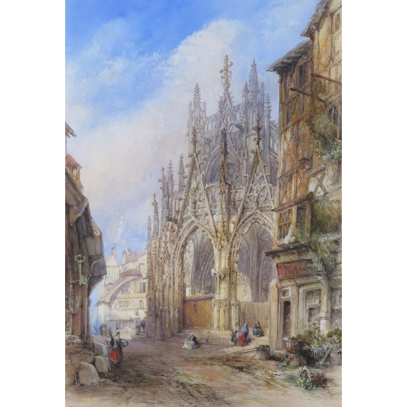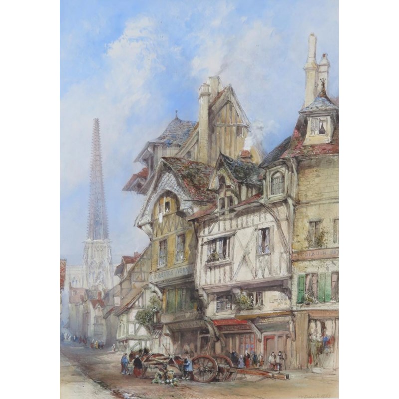 Thomas Colman Dibdin (1810-1893) Market produce falling from a cart by a cathedral; Figures by a...