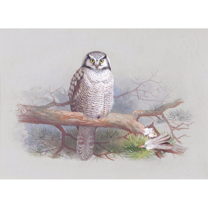 Archibald Thorburn (1860-1935) Hawk owl Signed Watercolour on grey paper 16.5 x 23cm; 6½ x 9in