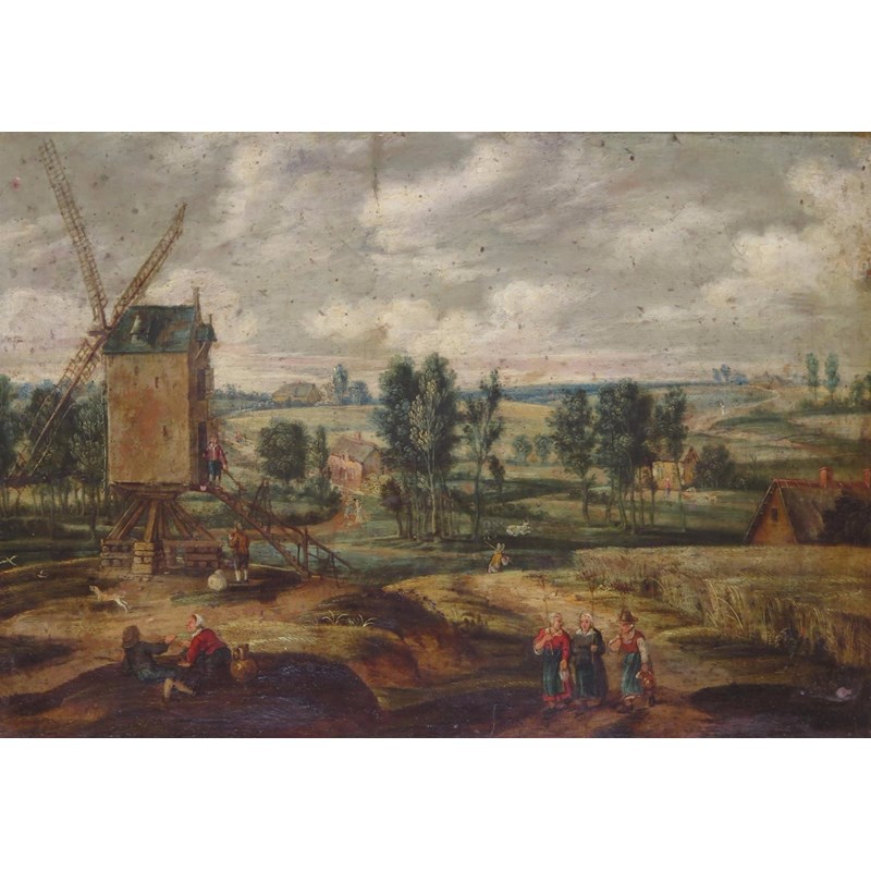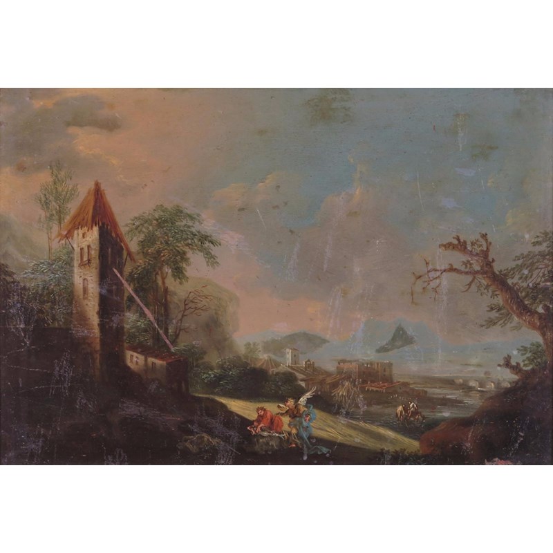 Dutch School 18th Century Harvesters by a windmill; Tobias and the angel Two
