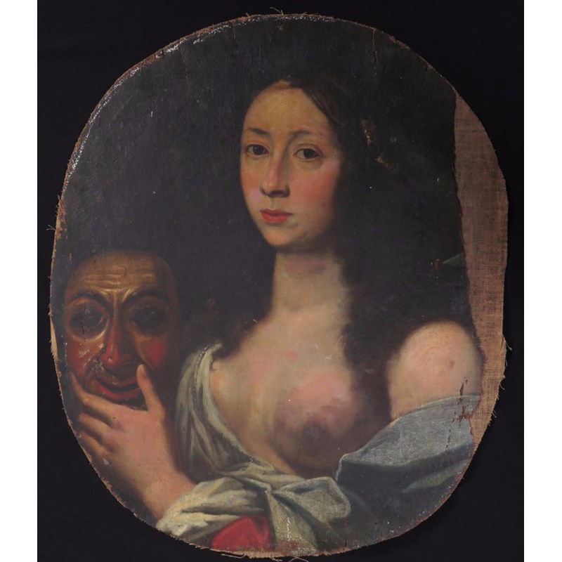 English School 18th Century Portrait of an actress holding a mask Oil on canvas