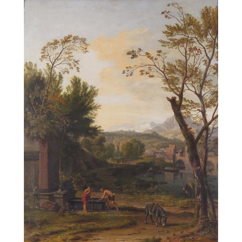 Jean Francisque Millet the Younger (French 1666-1723) Figures pausing for water in an Italianate...