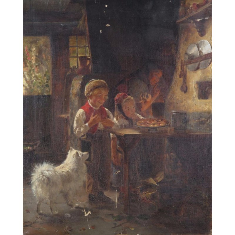 Russian School 19th Century A woman baking tarts with her children and Samoyed dog Signed...