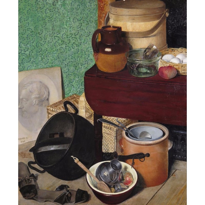 Thomas Fowke (1827-c.1887) Still life of pots and pans with sandals and a bust relief Signed and...
