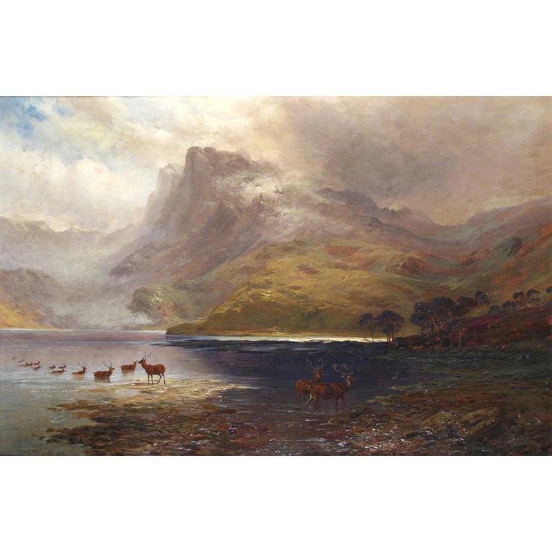 Clarence Henry Roe (1850-1909) A Highland view with stags crossing a loch Signed twice and dated...