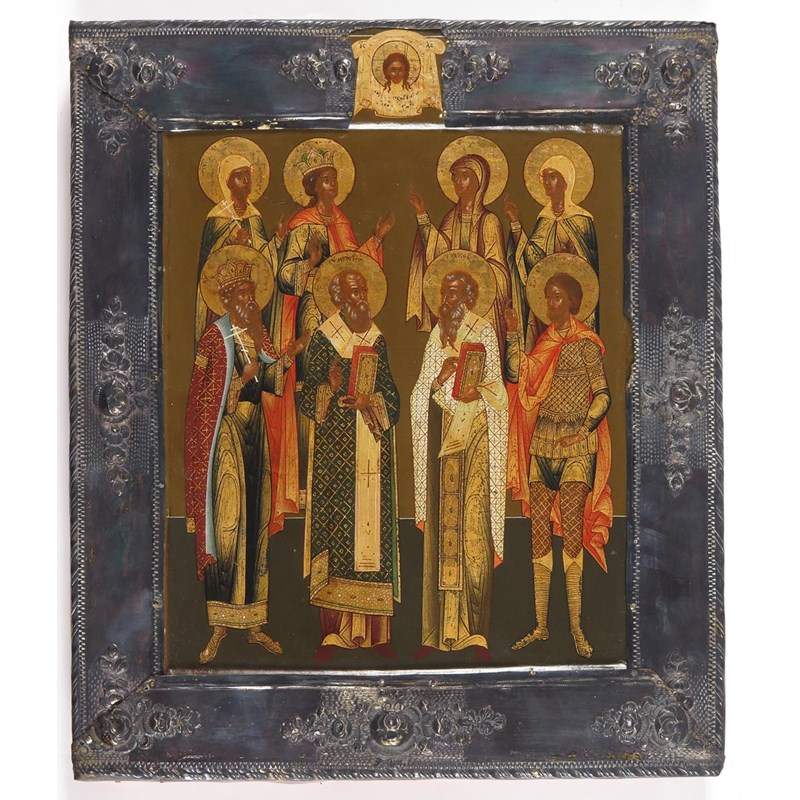 Russian School 18th Century Icon of a group of eight saints