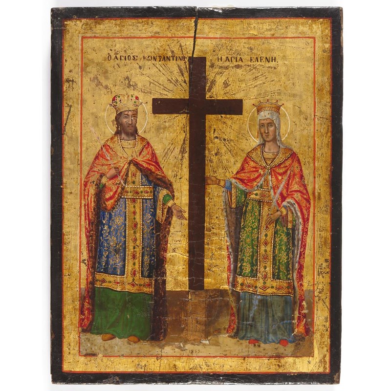Greek School 19th Century Icon of Saints Constantine and Helena with the true cross Painted and...