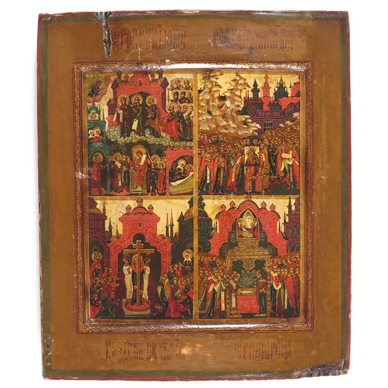 Quadripartite icon of The Pokrov; The Procession of the icon, Moscow; The Exaltation of the True Cross; The Installation of the Girdle of the Mother of God