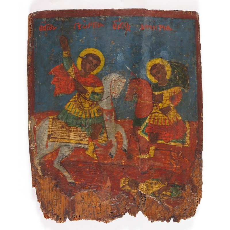 Greek Orthodox School Icon of St. Georges and St. Dimitris Painted on panel 34 x 28cm; 13½ x 11in...