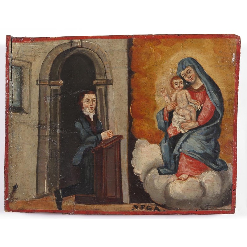 Spanish School early 19th Century An ex-voto icon of a supplicant praying to the Virgin and Child...