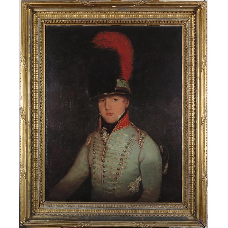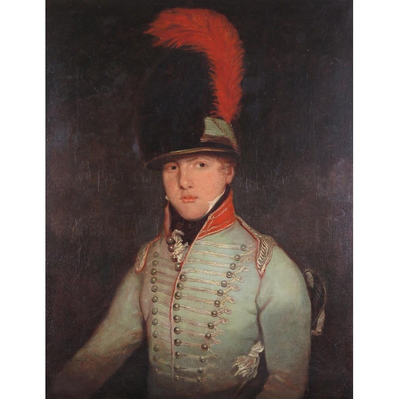 Portrait of an officer, half length, wearing a bearskin with a red plume