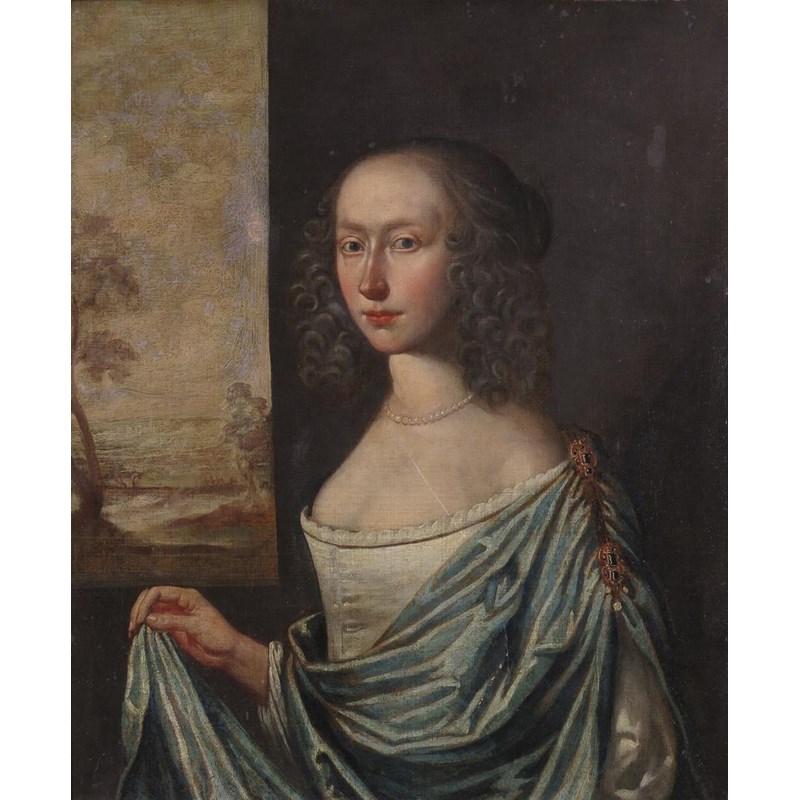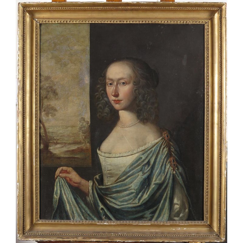 Portrait of a lady, half length standing by a window, a landscape beyond