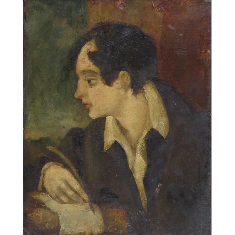 H. Dawson (18/19th Century) Portrait of Lord Byron writing Inscribed and signed verso Oil on panel