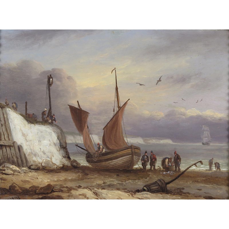 Thomas Luny (1759-1837) A beached fishing boat by a cliff with fishermen and women Signed and...