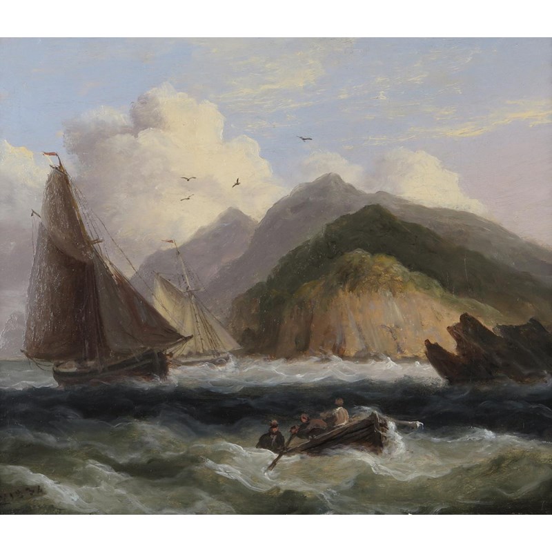 Thomas Luny (1759-1837) Fishing boats and figures in a rowing boat in choppy seas by a rocky...