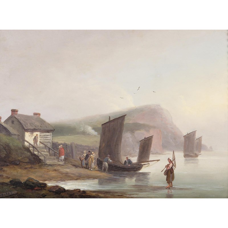 Thomas Luny (1759-1837) Fishing boats and figures by a cottage on the coast Signed and dated 1827...